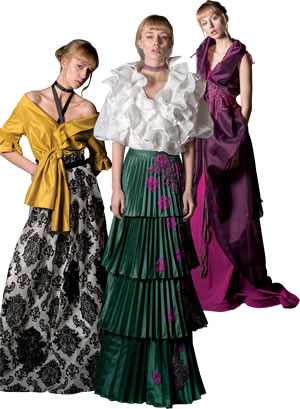 Dilek Hanif Hazır Giyim 2017-18 Sonbahar- Kış koleksiyonunda ise sezonun trendlerini Dilek Hanif tasarım kodlarına göre yorumladığımız bir çizgi hakim. Yüksek yakalar, kıvrımlı kol detayları ve boyun bağlarıyla süslenmiş uzun romantik elbiseler 2018 yılı koleksiyonlarımda en çok çalıştığım tasarımları oluşturuyor. Koleksiyon, 19. yüzyıl sonu Viktorya Dönemi’ne atıfta bulunuyor ve 60’ların stil ikonu Jackie Kennedy’nin vazgeçilmezi inci işlemelerle tamamlanıyor. Efsanevi fotoğraf sanatçısı ve moda filmi yönetmeni Nick Knight’ın eserlerinden ilham alan gül desenleriyle uçuş uçuş şifonlar da adeta canlanıyor, sıcak bir sonbaharı karşılıyor. Dilek Hanif Hazır Giyim 2017-18 Sonbahar-Kış Koleksiyonu’nun ana hatlarını oluşturan sezonun trendi bronz tonların yanı sıra koyu ve kayrak griler, sıcak tarçınlar, kırık beyazlar ve yanardöner etki veren gümüş lameler mavi şifonlarla bir araya geliyor. Vazgeçilmez siyah dantel detaylar ve lame kurdeleler kristal işlemelerle birleşerek görünüme asalet katıyor. Yılbaşı gecesinde siyah ve kırmızı giyinmek yıllardır süregelen bir alışkanlığımız; fakat kıyafet tercihlerimizi sadece iki renkle sınırlamamız gerekmiyor. Her şeyden önce yılbaşı geceleri parlak süslemeleriyle bir ihtişamı temsil ediyor. Tüm bu ihtişamı doğru tercihlerle kombinlerimize yansıtmak ise mümkün.